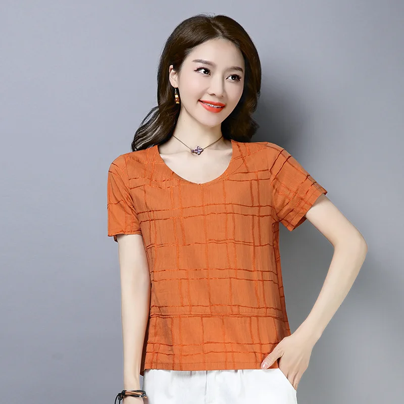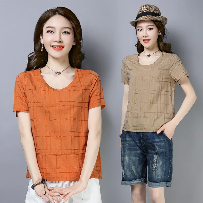 Best Photo Shoot 2019 Summer Cotton Linen Tops WOMEN'S Short Sleeved New Style Crew Neck Slimming Elegan